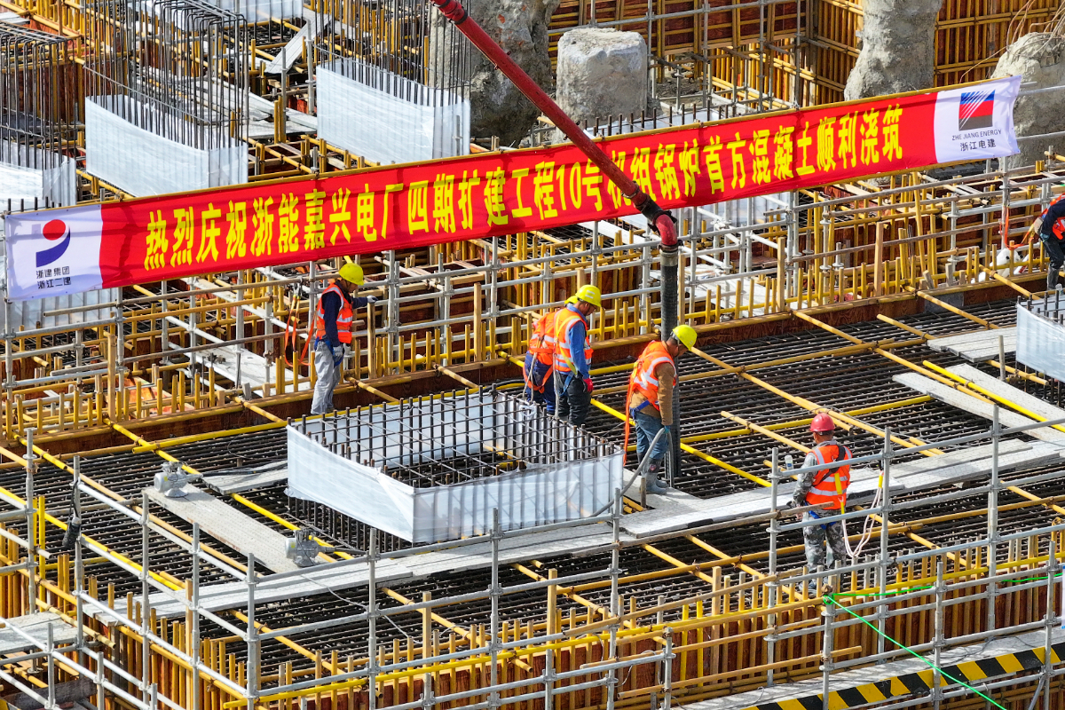混凝土沿輸送管勻速流淌,精準(zhǔn)注入浙能嘉電四期10號機(jī)組鍋爐房基礎(chǔ)模板。 鄭嘯 攝